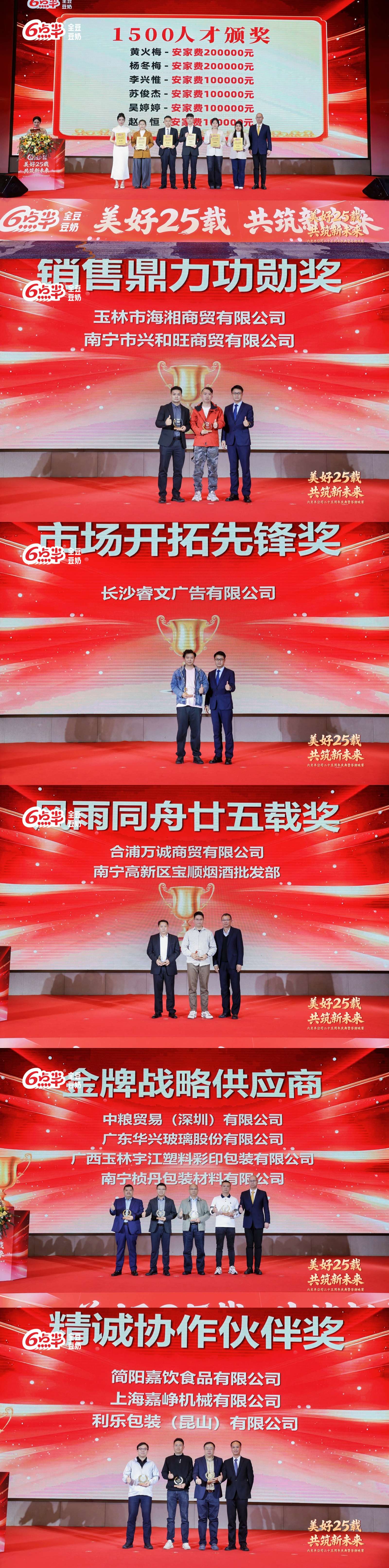 同时,公司正式启动“六点半1500人才工程”。二十五年的稳健发展,六点半始终坚信,人才是第一资源。为此,公司专项投入 1500 万元人才发展资金,吸引优秀本科、硕士、博士人才加入,以实打实的投入赋能人才成长,搭建完善的成长通道与创新平台,让每一位有志青年都能在这里安家落户、逐梦成长,为企业高质量发展注入源源不断的青春活力。庆典现场为首批优秀青年人才颁发本科级10万元、硕士级20万元的奖励,体现出企业重视青年力量、持续投入人才培养的战略考量。在合作伙伴表彰环节,六点半向多年来同舟共济的经销商与供应商颁发了“销售鼎力功勋奖”“市场开拓先锋奖”“风雨同舟廿五载奖”“金牌战略供应商”及“精诚协作伙伴奖”等多项荣誉,感谢他们在市场开拓、供应链协同、服务支持等方面的卓越贡献。